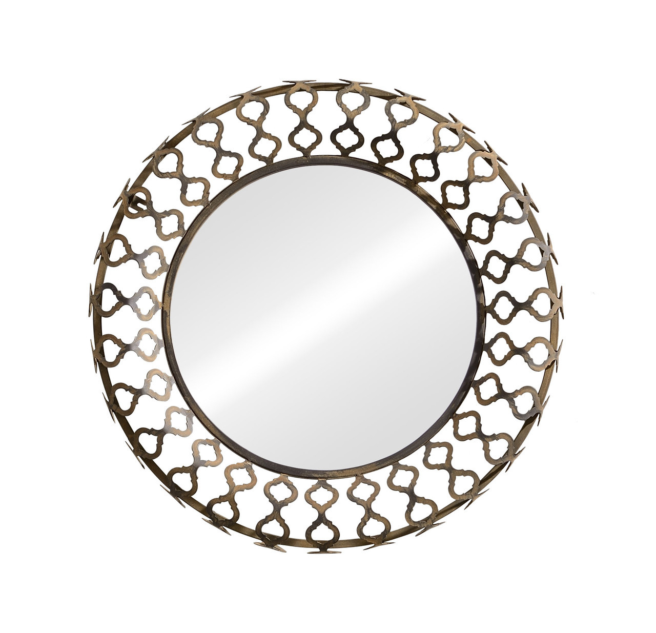 Surrounded by filigreed arches, the Bass Mirror goes modern with a traditional twist. Delicate curving diamonds are picked out in rusted metal. This circular mirror looks lovely in any room.