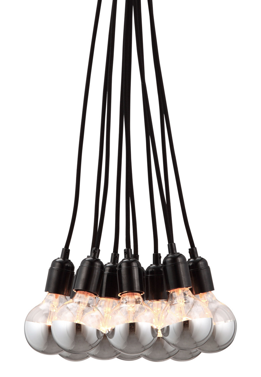If less is more, this lamp is all that. A bouquet of chrome-tipped hanging bulbs, the Bosonic Ceiling Lamp is pure utilitarian elegance. Features ten chrome-dipped 25 watt bulbs hung by black braided cord.
