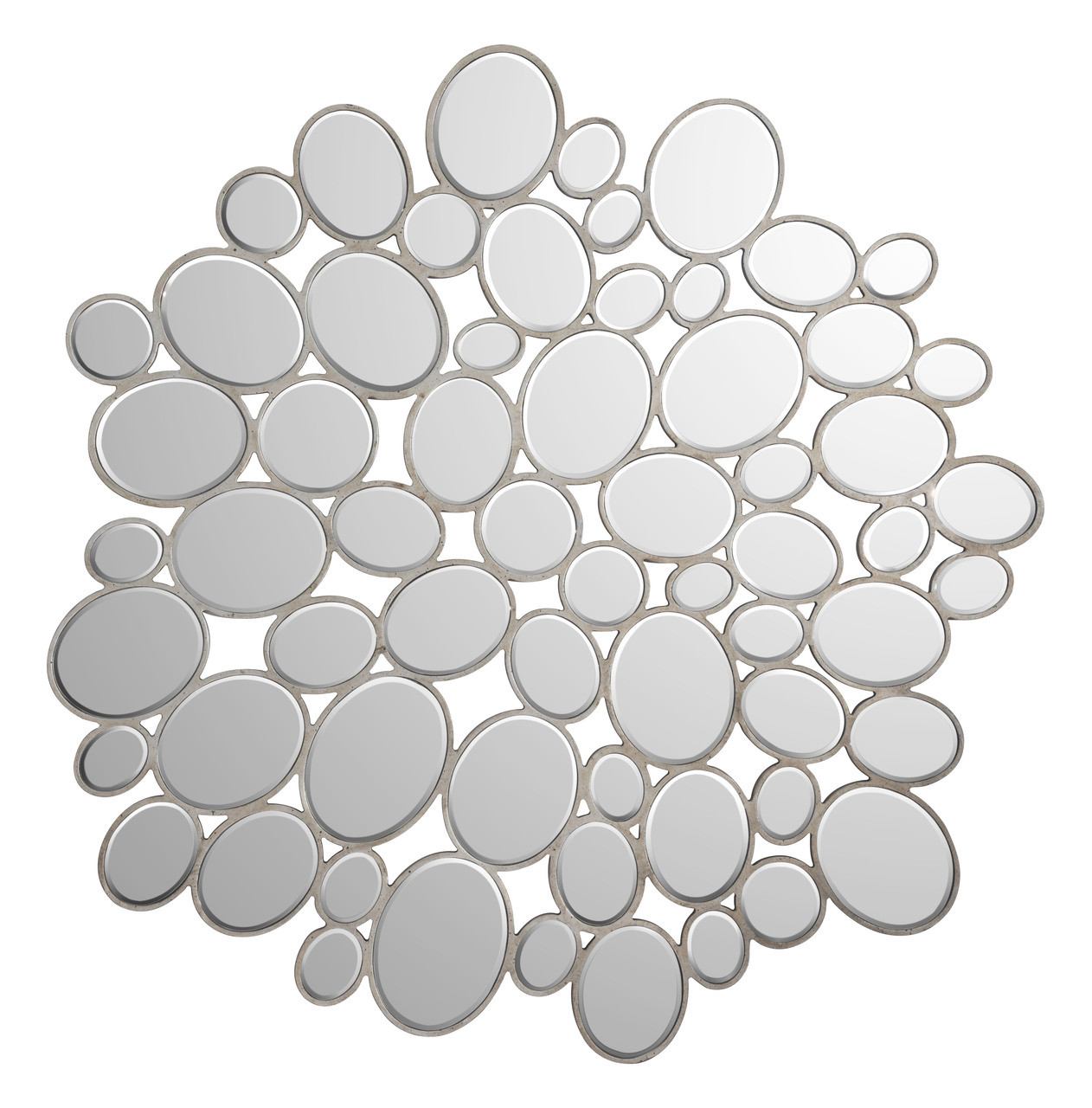 Modern style Boss mirror features small pebble mosaic pieces set in small silver frame arrange in round pattern. Perfect for living or dining room, entry or hallway applications. Size: 47.2" w x 47.2" h .