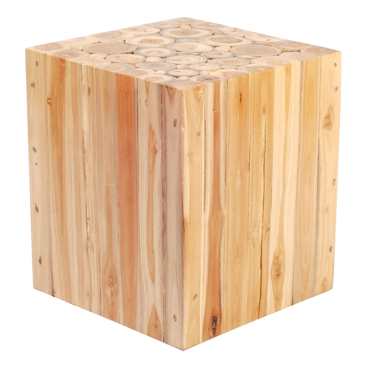 Cave stools are made of solid teak wood piece cut to showcase the interior natural rings, then assembled to form a square table. Temper glass top while teak is wax finished.