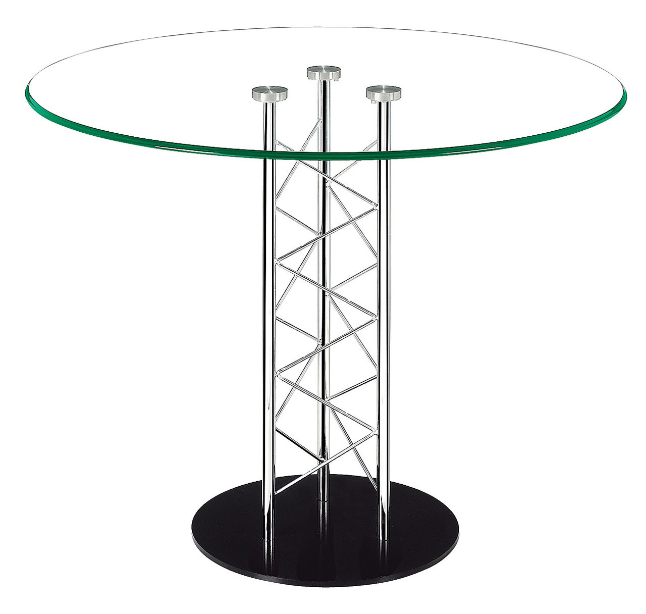 Like an architectural tower, the Chardonnay dining table has a clear tempered glass top with a chromed steel tube center and a black solid steel base plate. The intricate diagonal latticing comes in both bar and dining heights.