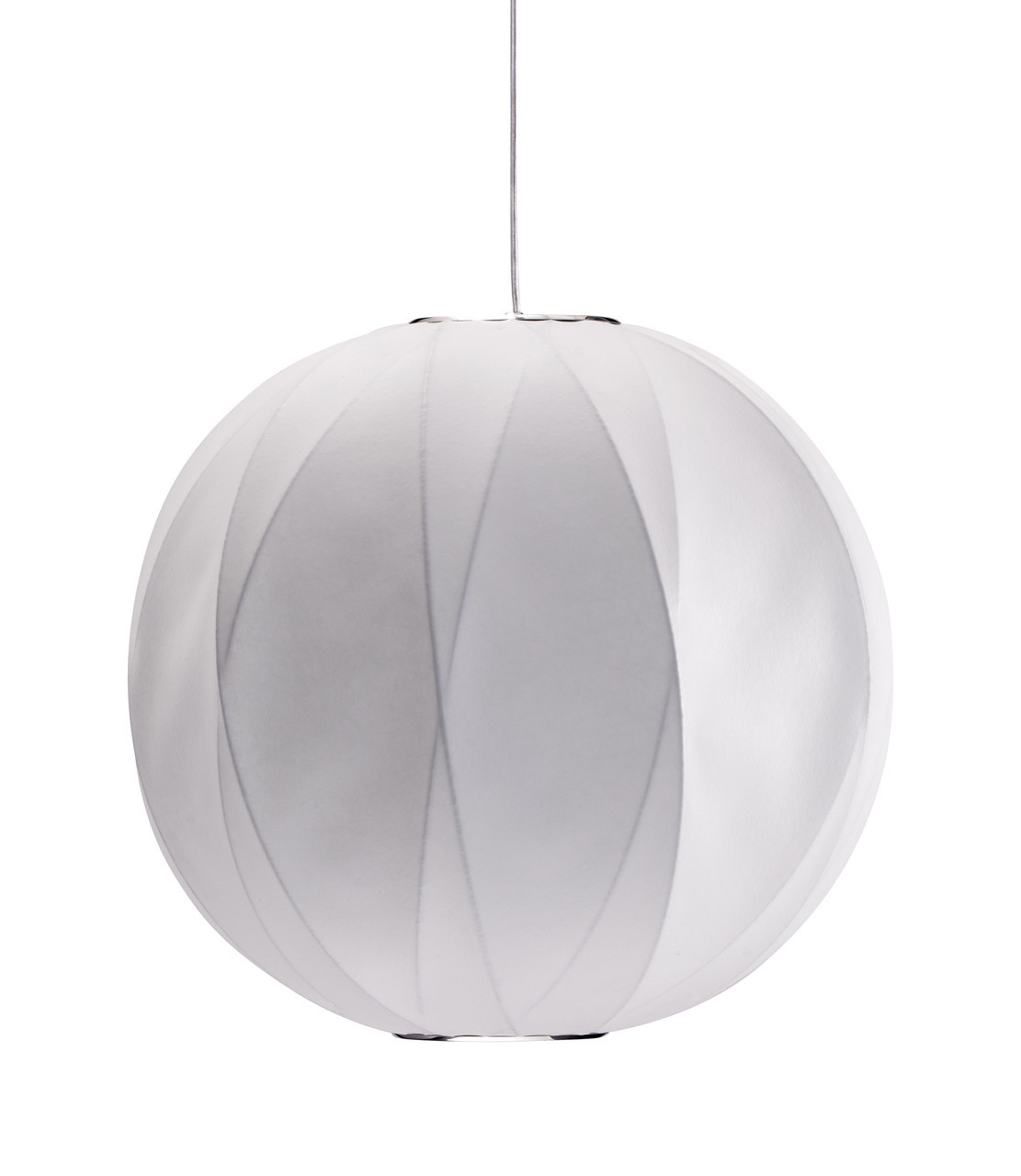 Hangs like the moon over the dining room table. White silk wraps around a curved wire frame to form the Coriolis Ceiling Lamp. Adds a subtle elegance to the upper real estate of any room.