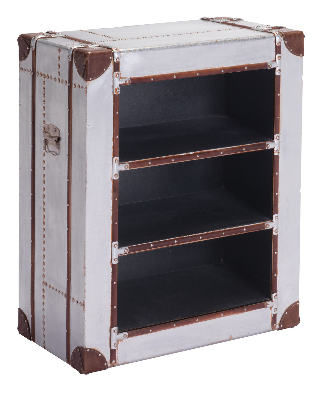 The Engel distressed aluminum shelf has 3 small cubbly style openings finished inside with soft polyester fabric. Overall details include leatherette corner swatches adhered by small nailheads. Hardware accents vintage style brushed metal handles, anchored to either side for easy in transportation.