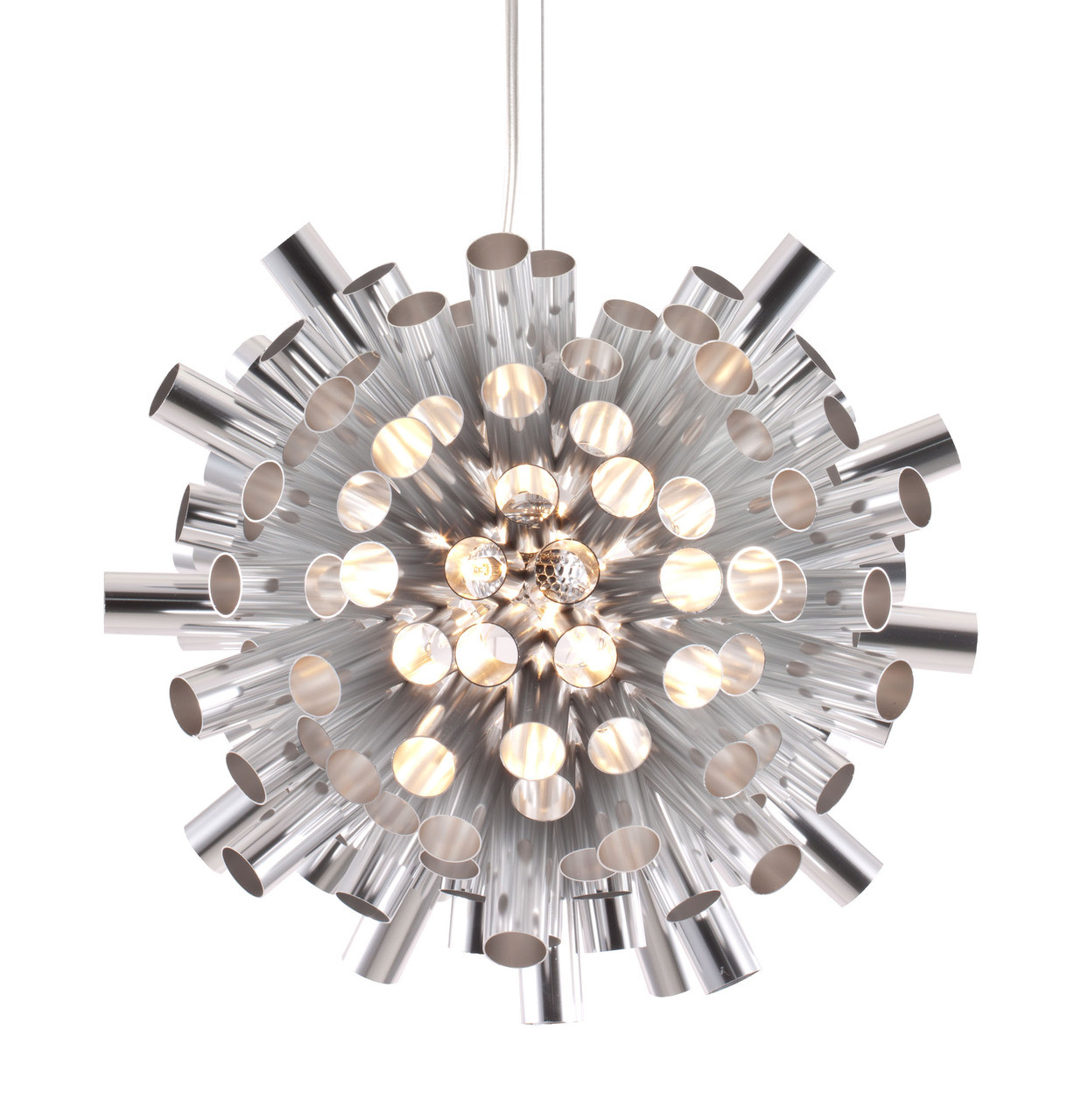 Let the burst of aluminum engulf you in all its glory. The luminescent Extravagance Ceiling Lamp has an aluminum shade with a height adjustable chrome body. Comes with ten watt halogen bulbs.