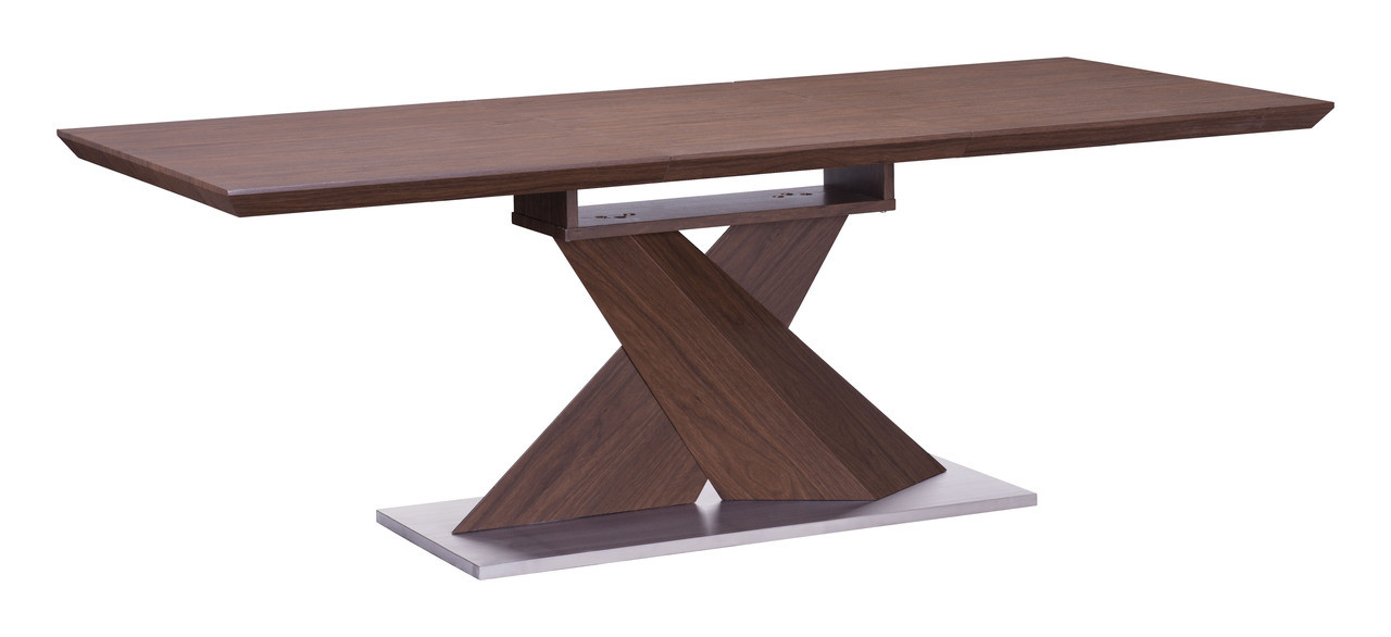 With a melamine veneer, the Jaques extension table converts from a six to eight table fit for large dinner parties. The base plate is stainless steel with gives the warm walnut tones a good contrast for style. This table is stunning and versatile.