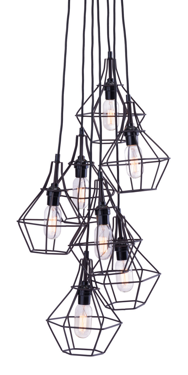 Palmerston Ceiling lamp has 7 unique pendants clustered in a stagger pattern, hung by slim black cords. Each pendant has a frame work in a jeweled shape with distressed black finish metal enclosed around oblong Edison style bulbs. Glamorous or rustic, this splendid ceiling fixture will add dimension to any room regardless of the application.