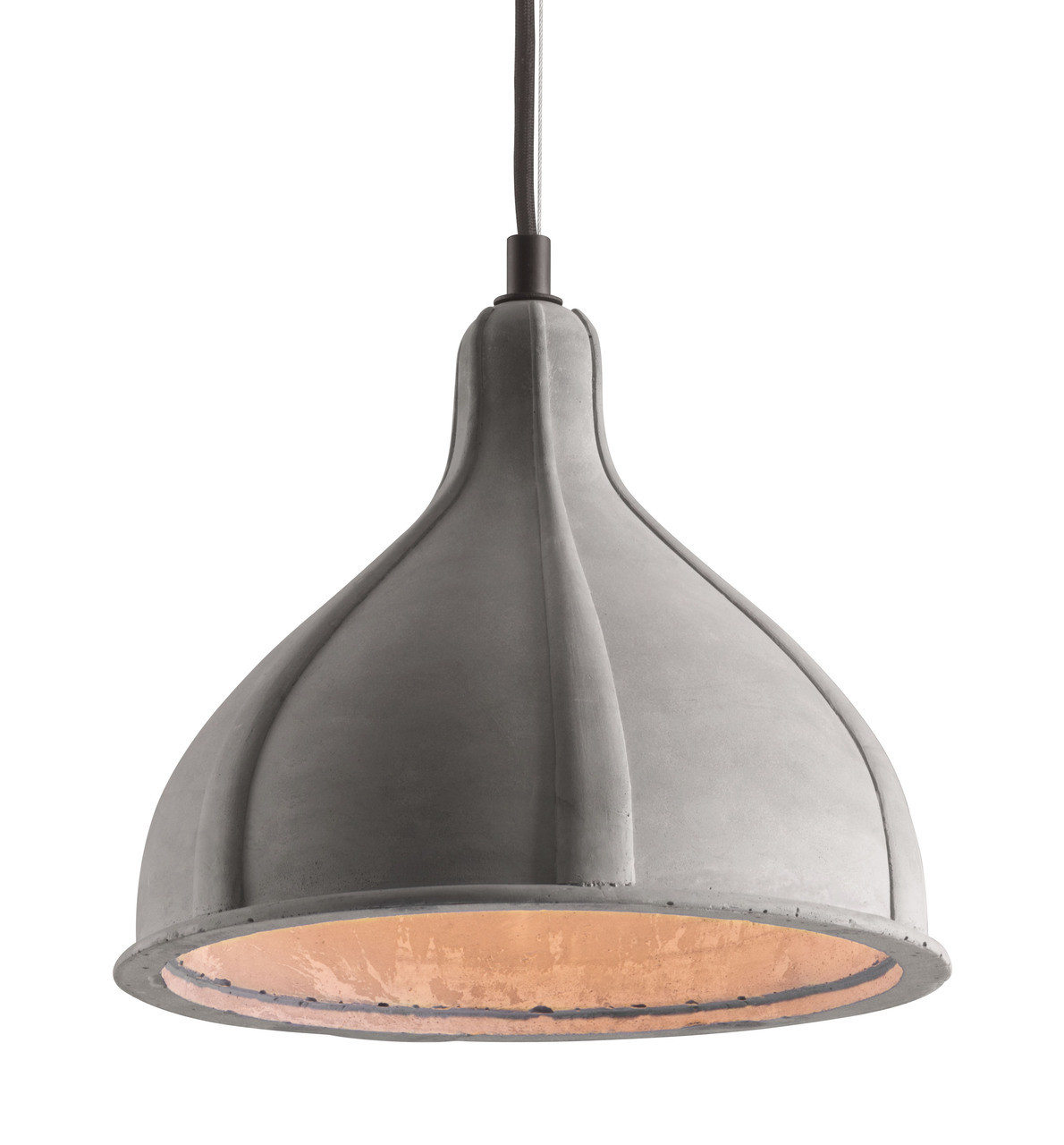 Prospect ceiling lamp is made of of light-weight faux concrete in a soft tear shape. Faux concrete finish is in a warm grey tone outside and inside of shade. Install alone for a industrial look for kitchen or bar areas or hang several in restaurants. Suspended wire with black mounting fixture and finished with black electrical cord.
