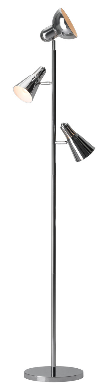 Shuttle floor lamp blasts off with round base and slim body, accented by 3 pivot style chrome shades to highlight any living room, office or hotel guest room.