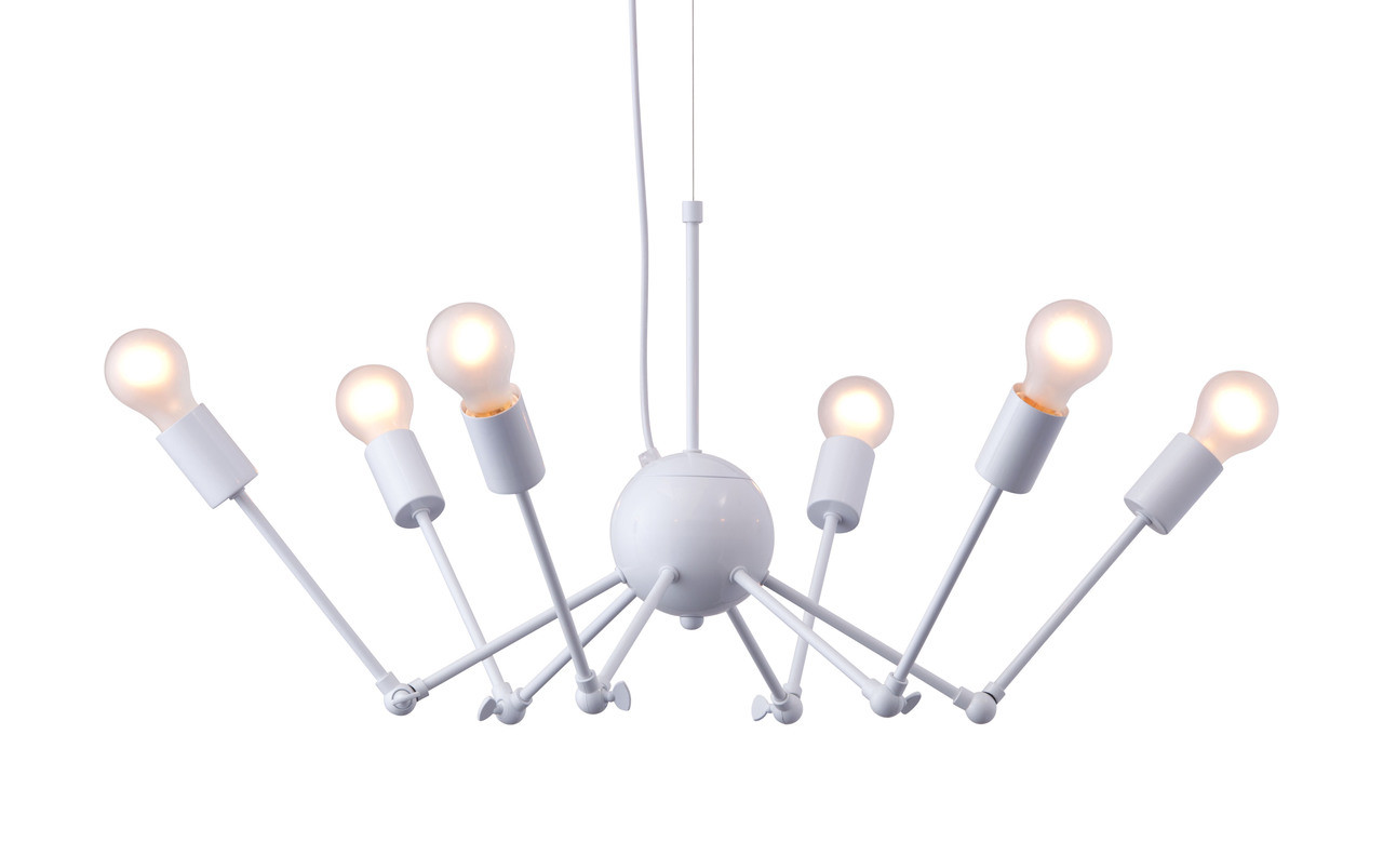 Like a prizefighting octopus, the Snow Ceiling Lamp battles the boring. Made of painted metal with six 25 watt bulbs. Tilt your head and the sea creature morphs into an elegant chandelier.