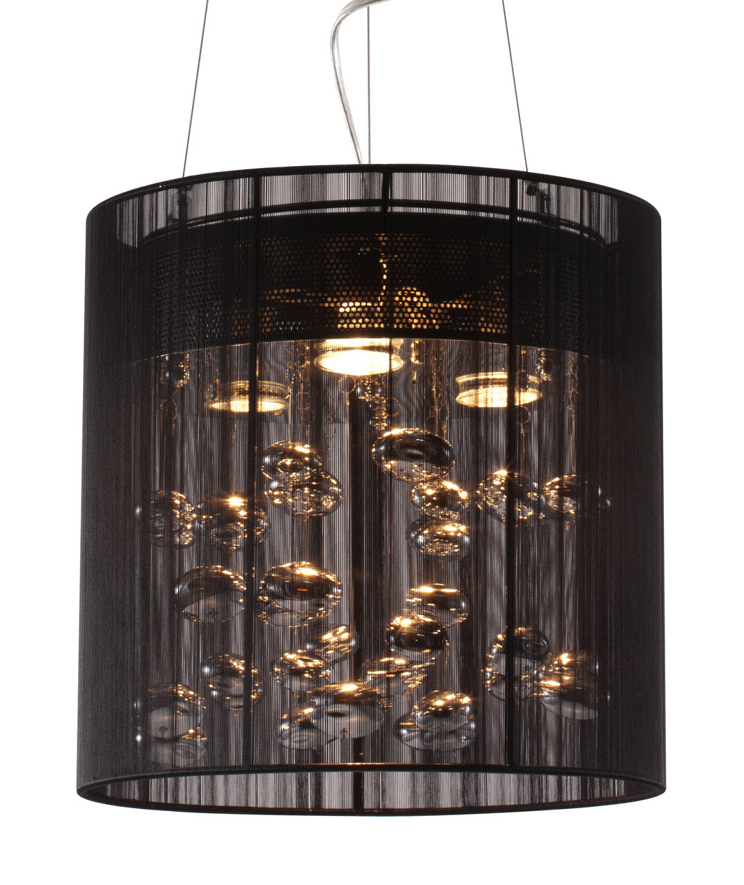 The Subatomic Ceiling Lamp creates the illusion of pools of liquid chrome floating under a black lace veil. The chandelier length can be adjusted as needed. Has three 50 watt halogen bulbs.
