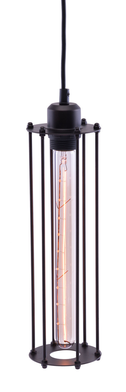 Tauranga Ceiling lamp is a slip oblong shaped filament style bulb surrounded by distressed black finished framework. Sinlge pendant stands alone or stuns in groups over a bar or counter.