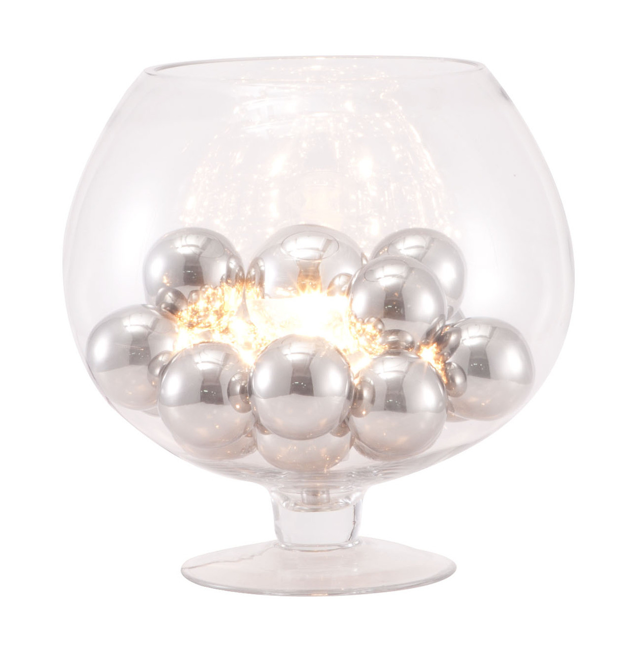 Like a magic glowing goblet, the Terran Table Lamp offers a unique element to the space. The light sparks and shines off the chrome spheres and through the curving glass. Put it on a bureau for a gentle glow through your bedroom or on a small table to quietly light the living room.