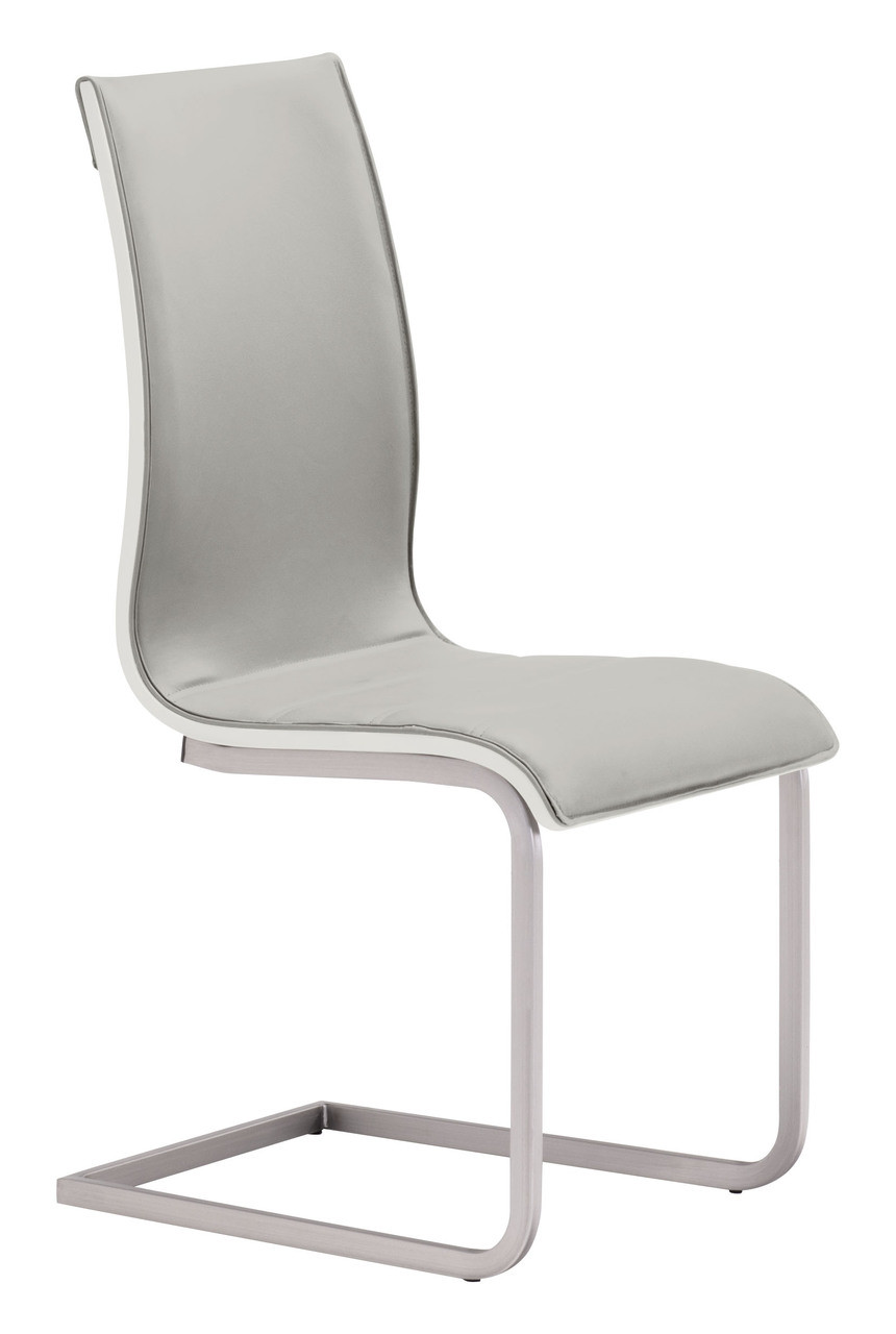 The Trembles Dining Chair integrates a stark white back with a delicate leatherette finished fabric, while the leatherette back smoothly rises from seat to back and gingerly wrapping over top edge: creating an exclusive modern styling. The Trembles dining chair will updated any dining or conference room. Finish is white with warm grey or taupe leatherette fabric.