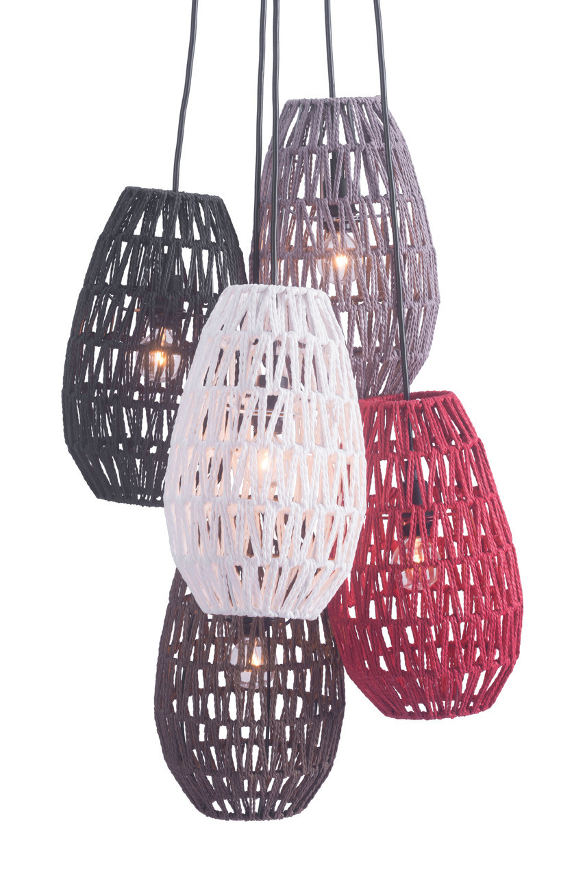 Utopia ceiling lamp lives up to it's name with 5 colored tear shaped pendantscreated with woven polyester shades in cream, ruby, lavender, warm grey and graphite. Each shade surrounds a metal architecture with an woven thread zig zag pattern woven throughout creating a soft, see through shade. Install in kitchens or dining rooms, hotels or lobby's, perfect for day spas for a softer look to your modern design.